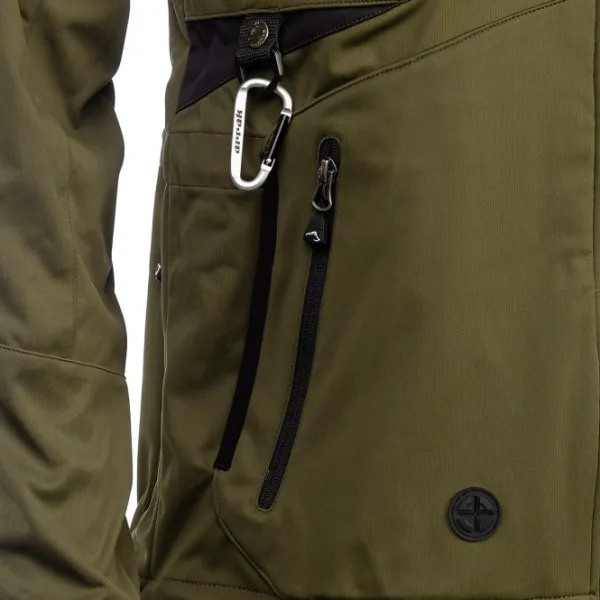 Koiranohjaajan vedenpitävä softshelltakki, paljon taskuja.