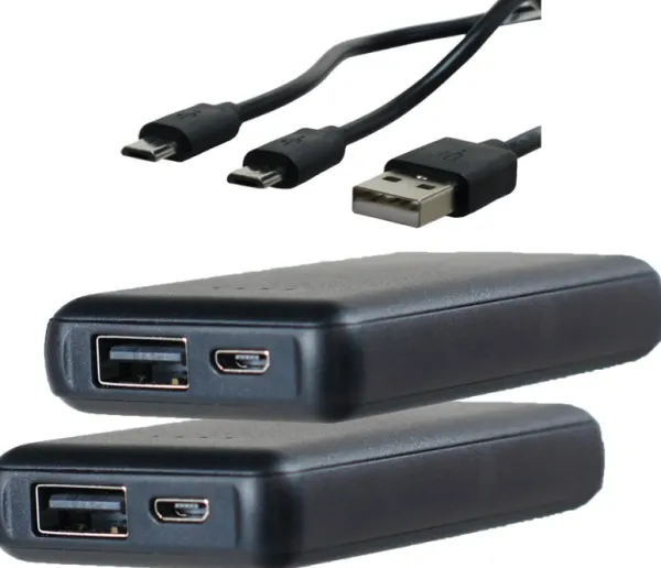 - Sisältää kaksi ladattavaa 3000 mAh Power Bank -akkua, jotka voidaan ladata tavallisella micro-USB-laturilla