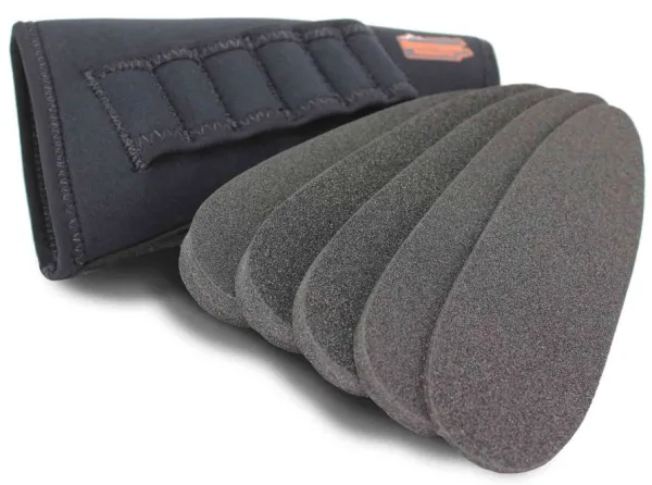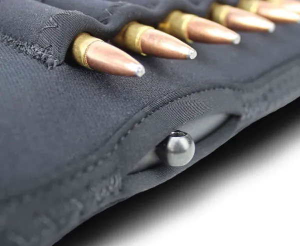 Säädettävä poskipakka jossa patruunatasku kuudelle kiväärinpatruunalle. Mukana viisi säätöpalaa.