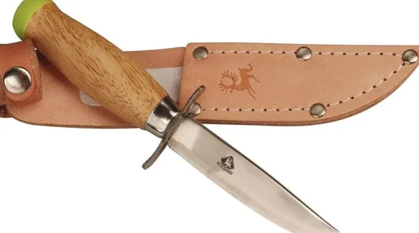 Brusletto Speiderin terä on pyöristetty. Tämä puukko sopii erityisesti aloitteleville vuolijoille.