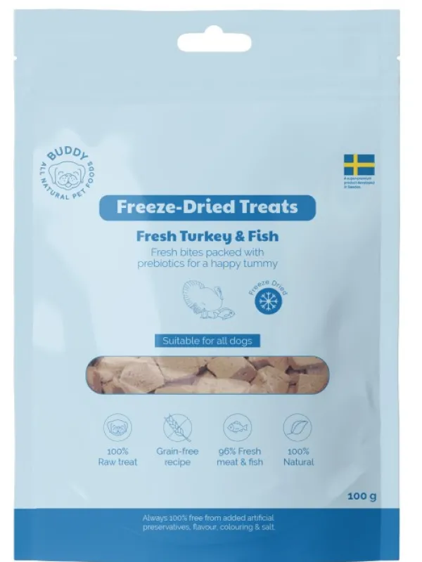 Tarjoa koirallesi makuelämys Freeze Dried Treats Raw -herkkujen muodossa, joissa on kalkkunan ja kalan makua. Nämä Buddy-merkin pakastekuivatut herkut sisältävät jopa 96 % tuoretta lihaa.