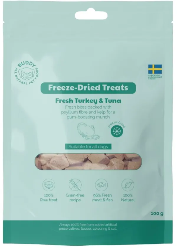 Tarjoa koirallesi makuelämys Buddy Freeze Dried Treats Raw -herkkujen muodossa, joissa on kalkkunan ja tonnikalan makua. Nämä Buddy-merkin pakastekuivatut herkut sisältävät suuren osan tuoretta kalkkunan- ja tonnikalanlihaa.