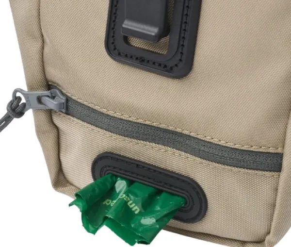 Turvallinen magneettisulku tarjoaa nopean pääsyn makupaloihin, ja sisäänrakennettu annostelija pitää kakkapussit valmiina käyttöön. Säilytä naksutin, avaimet tai maksukortti turvallisesti ulkopuolisessa vetoketjutaskussa.