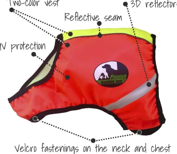FinNeron UKKO huomioliivi on erittäin tehokas kaksivärinen heijastin- ja näkyvyysliivi, joka on erityisesti suunniteltu metsästyskoirille, mutta sopii myös metsäreissuille ja päivittäiseen käyttöön.