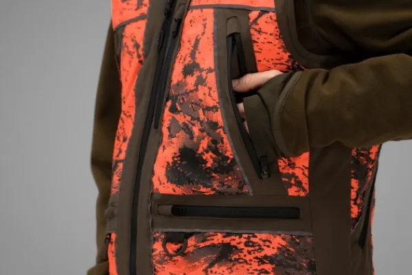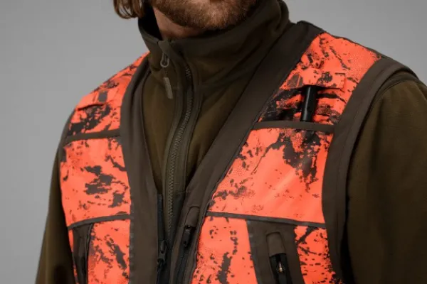Härkilä Wildboar Pro -metsästysliivi on valmistettu kestävästä materiaalista, jossa on AXIS MSP® Blaze -turvacamokuviointi. Vuori on hyvin hengittävää verkkokangasta, joka edistää ilman kiertämistä aktiivisen metsästyksen aikana. Pystyyn ja poikittain ommellut heijastinnauhat lisäävät näkyvyyttä. Vetoketju on kaksisuuntainen. Liivissä on kaksi lämmittelytaskua, kaksi etutaskua patruunapidikkeillä, radiotaskut molemmin puolin sekä tilava takatasku. Kaikissa taskuissa on vetoketjut, ja radiotaskuissa on antennipidikkeet. Lisäksi etutaskuissa on kaksi jämäkästi ommeltua D-lenkkiä erilaisille varusteille.