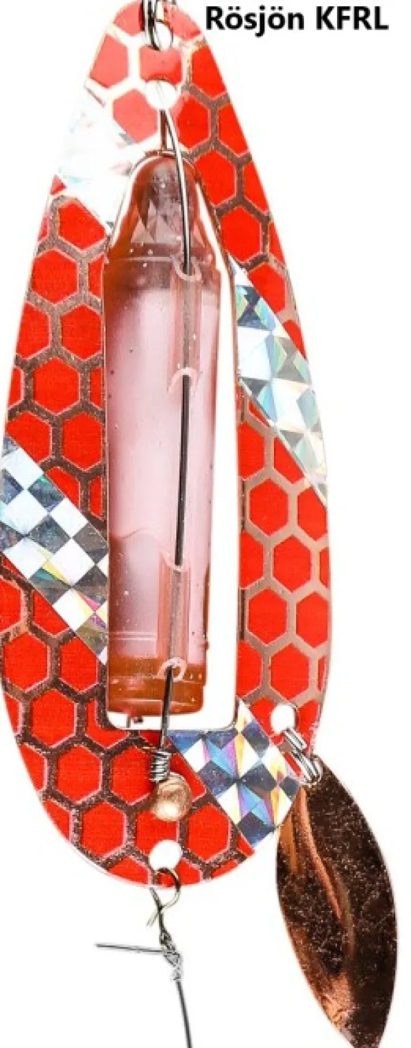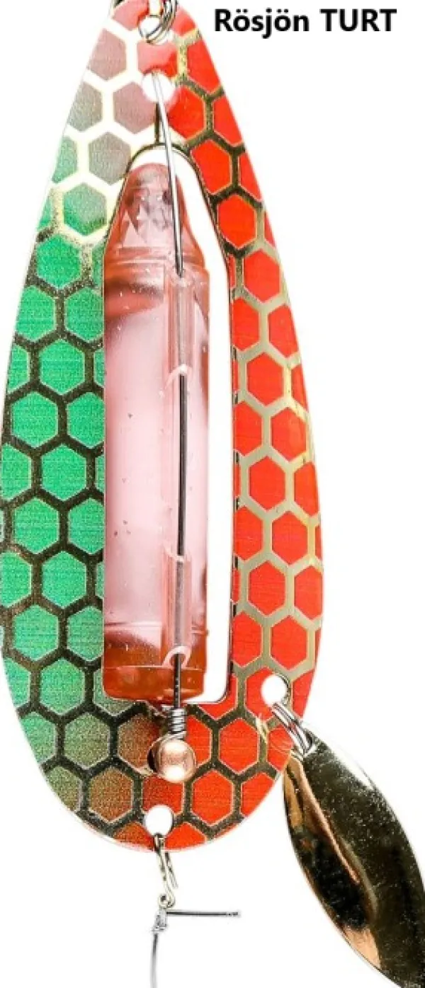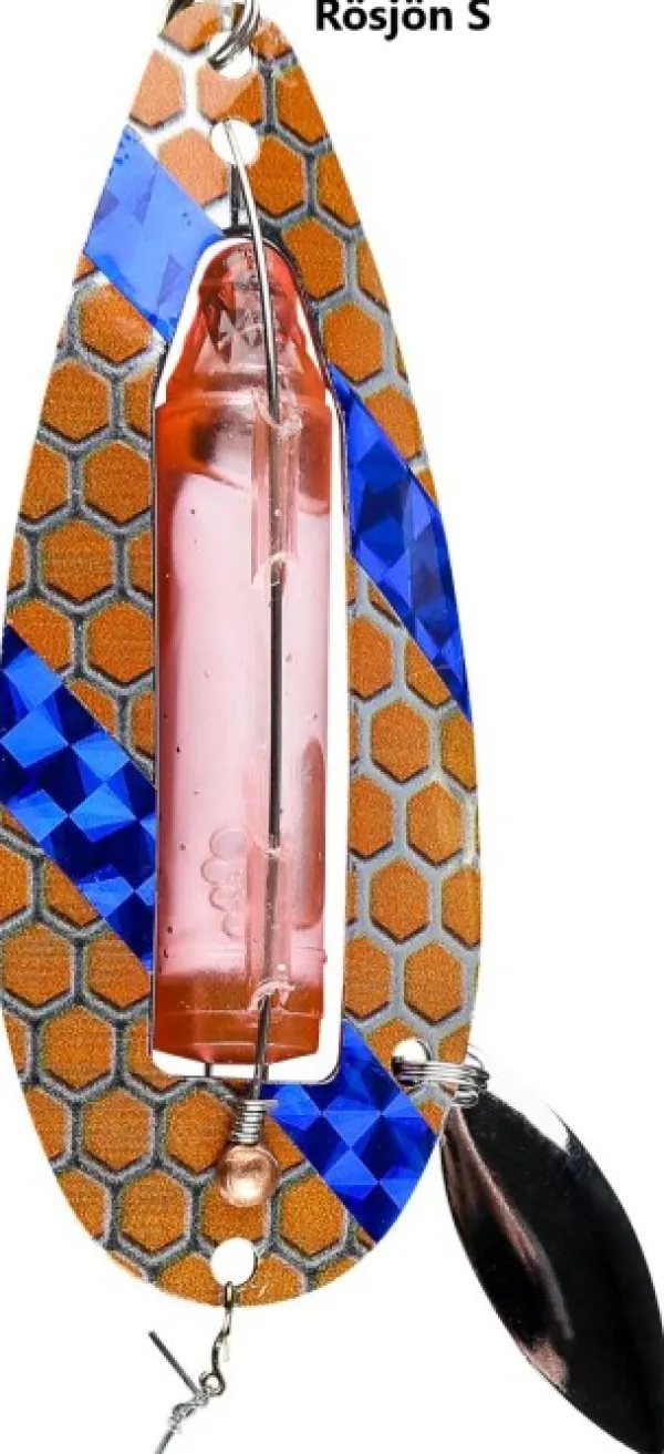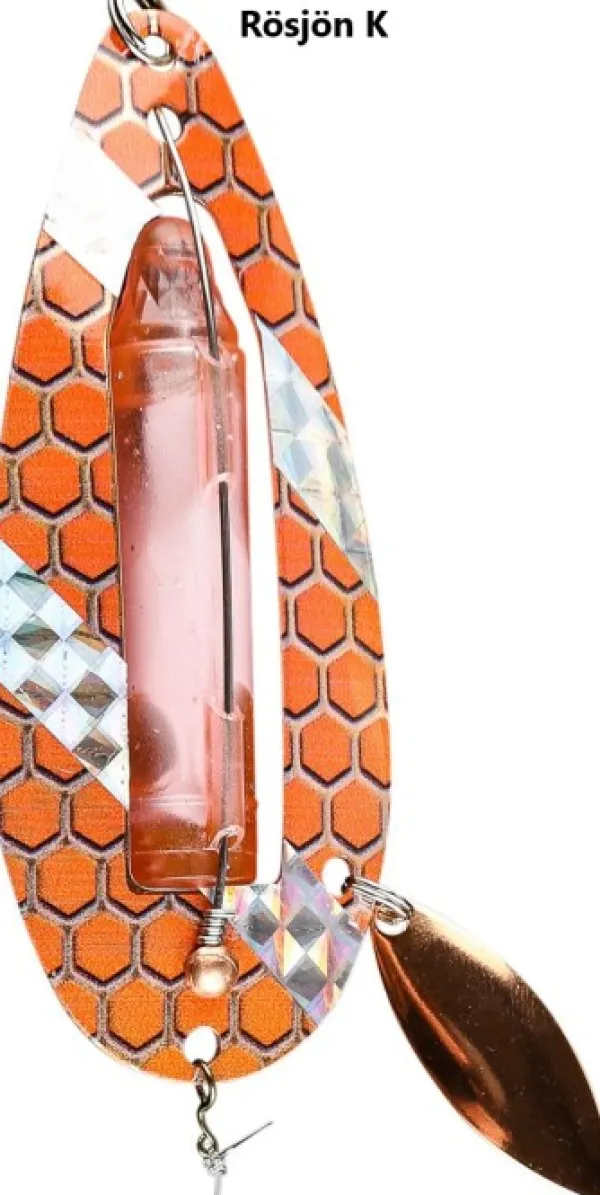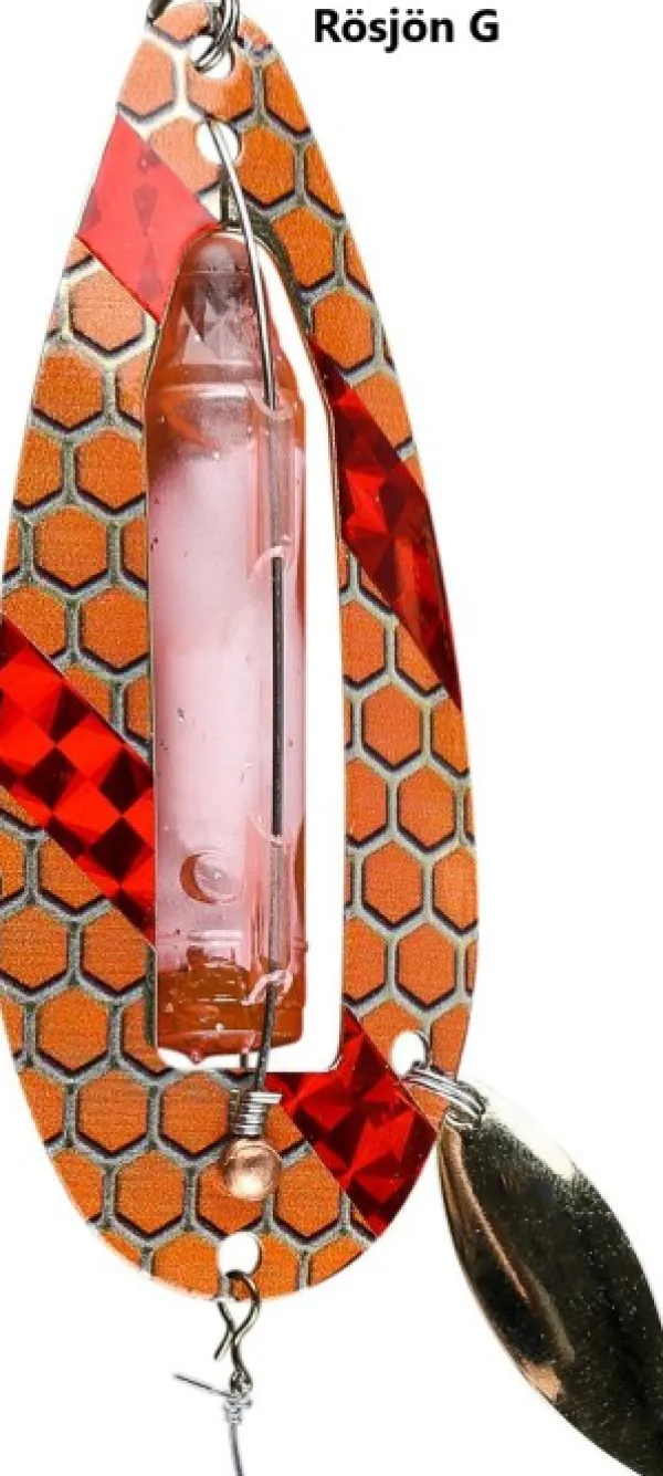 Nieriäviehe, jossa LED-vilkku ja matokoukku. Pituus 85 mm. Vilkulle on aukko, josta se näkyy kaikkiin suuntiin.