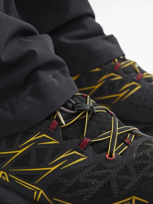 Rakenne on mukautettu maksimaaliseen liikkumisvapauteen esitaivutettujen polvien ja materiaalin joustavuuden ansiosta. Vahvistettu Duracoat™-materiaalilla polvista ja lahkeensuista. Joustava, säädettävä kiristysnyöri lahkeensuissa ja kiinnityskoukku kengännauhoille. WindStretch™-materiaalissa käytetään Bluesign®-hyväksyttyä Bio-Mass -polyamidia.