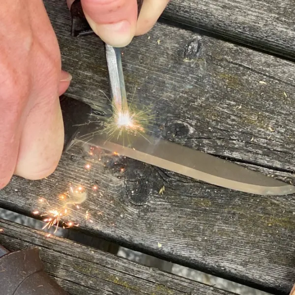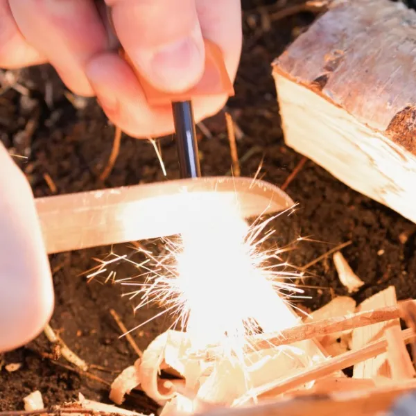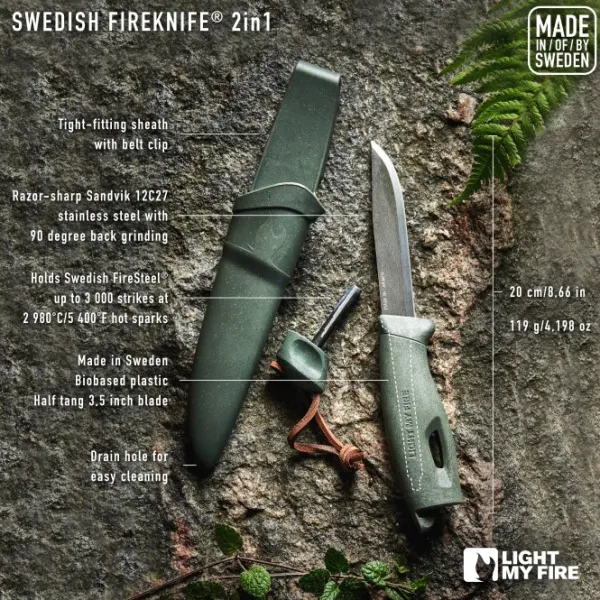 Setti, jossa on puukko ja sytytysrauta. Puukon terä on 90% laadukasta kierrätettyä ruostumatonta terästä, ja siinä on miellyttävä ja pitävä kahva. Sytytysrauta selviytyy kaikista sääolosuhteista, ja sitä voi käyttää jopa 3000 kertaa. Mukana on tuppi, jossa on vyökiinnike ja puhdistusta helpottava avoin pohja.