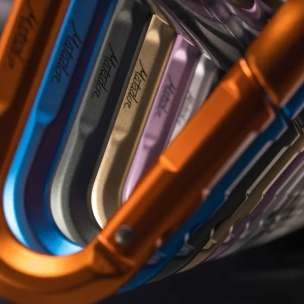 - Karabiini: Taivutettu 6061 alumiini (runko ja lukko), anodisoitu pinta, 316 ruostumaton teräs, 304 ruostumaton teräs, päällystetty sinkkikomponentti