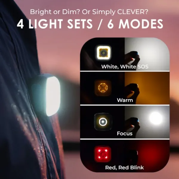 Light01:ssä on kuusi valotilaa – voit valita päivänvalon, lämpimän valon, kohdistetun valokeilan, jatkuvan punaisen valon, vilkkuvan punaisen valon sekä SOS-tilan. Säädä kirkkautta saumattomasti 1 %:sta 100 %:iin.