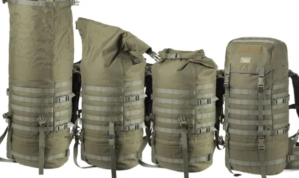 - Materiaalit: 1000D Cordura PU pinnoitteella, Delrin-erikoismuovisoljet ja kestävät spiraalivetoketjut, rangan materiaali DUR alumiini.