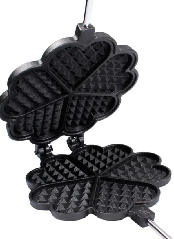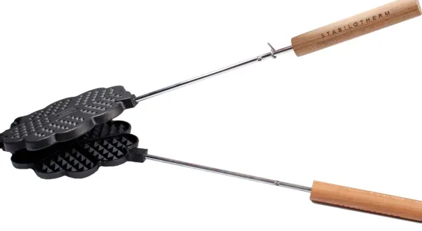 Aito Stabilothermin valurautainen vohvelirauta. Vohveliraudassa on puinen kahva ja pitkät varret, joten voit kypsentää vohvelit avotulella turvallisen matkan päässä. Raudassa voidaan tehdä normaalikokoisia vohveleita, jotka voidaan jakaa viiteen pienempään vohvelisydämeen.