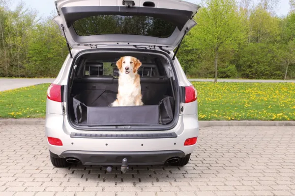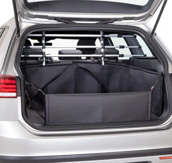 Käytännöllinen suojus auton tavaratilaan, jossa on myös irrotettava puskurinsuoja. Suojuksessa on korkeat laidat, jotka varmistavat, että lika ja koirankarvat pysyvät suojuksen sisällä. Suojus on suunniteltu sopimaan kaikenlaisiin autoihin. Valmistettu kestävästä nylonista, joka on helppo pyyhkäistä puhtaaksi kostealla rätillä. Suojuksen pohja on liukumatonta materiaalia, mikä tarjoaa koirallesi turvallisen paikan matkustaa. Suojuksen kulmissa on tarranauhat, joilla sen saa kiinnitettyä takapenkin niskatukiin.