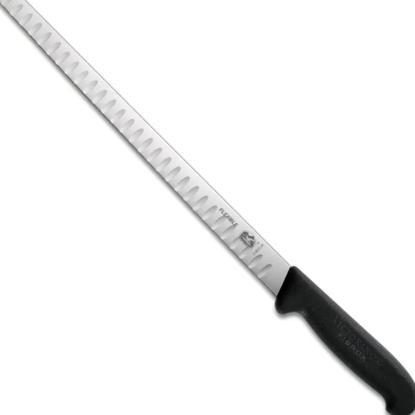 Victorinoxin sahalaitainen lohiveitsi 30 cm:n terällä. Terässä molemmin puolin liikkuvuutta edistävät ovaalihionnat. Veitsen kahva on kuituvahvistettua Fibrox-polyamidia, joka kestää jopa 150 °C:n kuumuutta.