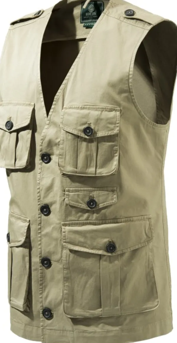 Berettan safariliivi on pehmeää puuvillaa. Serengeti-liivissä on useita hyödyllisiä yksityiskohtia, kuten rintataskut, läpälliset etutaskut sekä napit, joissa on Berettan oma muotoilu. Arvotavaroille on oma, pienempi taskunsa.