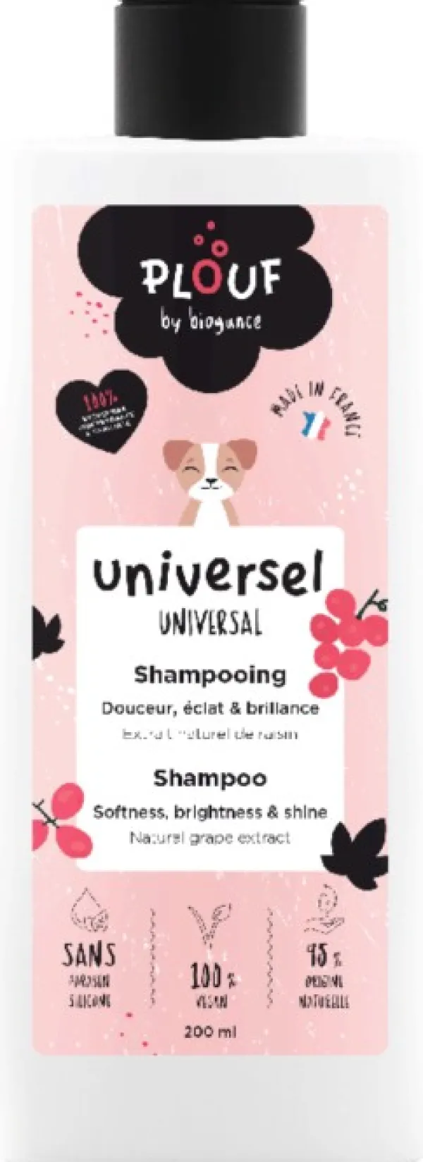 Plouf by Biogance yleisshampoo koirille luonnollisella viinirypäleuutteella. Se puhdistaa hellävaraisesti, antaa kiiltoa ja säihkettä, ja se sopii kaikille turkin tyypeille.