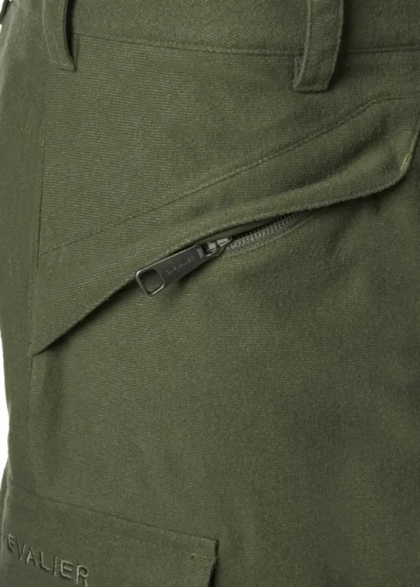 Chevalier Basset -metsästyshousut ovat tuulen- ja vedenpitävät, lämpimäksi vuoratut sekä hiljaiset miesten jahtihousut, jotka on valmistettu pehmeäksi harjatusta kierrätetystä polyesteristä. Housut ovat hyvin monikäyttöiset monenlaisissa metsästystilanteissa, ja niissä on useita tärkeitä ominaisuuksia. Housuissa on esitaivutetut polvet maksimaalisen liikkumisvapauden takaamiseksi metsissä ja pelloilla. Korotettu vyötärö ja mukautettu vyötärönauha, johon voi helposti kiinnittää henkselit joko napeilla tai soljella. Housuissa on tukevat vyölenkit ja viistot vetoketjutaskut edessä. Lahkeen ulkosivuilla on paljetaskut, joista oikeanpuoleisessa taskussa on vetoketjullinen turvatasku. Lahkeen sisäsivulla on vetoketjut ilmanvaihtoa varten. Lahkeensuissa on vettähylkivät YKK-vetoketjut ja Ripstop Cordura -vahvikkeet. Housujen lahkeensuun leveys on säädettävissä hakasella. Housuissa on lisäksi kummassakin lahkeensuussa hakanen, jonka avulla lahkeet saa kiinnitettyä kengännauhoihin ja housut saa pysymään paremmin paikoillaan. Basset-takki ja -housut muodostavat yhdessä tuulen- ja vedenpitävän, lämpimän ja hiljaisen metsästyspuvun.