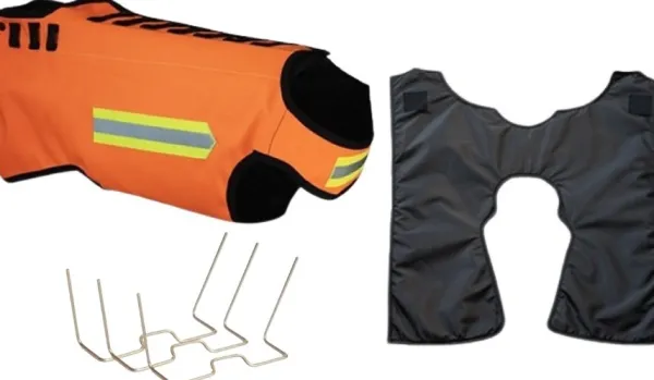 Modulaarinen suojaliivi, joka täyttää Agria-omavastuuvakuutuksen ehdot. Signaalivärinen perusliivi toimitetaan kellukkeilla.