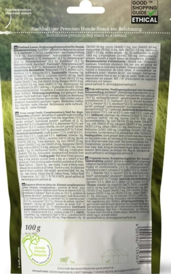GOOODies Soft Snack Adult Lammas on terveellinen koiranherkku, joka sisältää korkealaatuista proteiinia. Se on viljaton ja ei sisällä keinotekoisia säilöntäaineita.