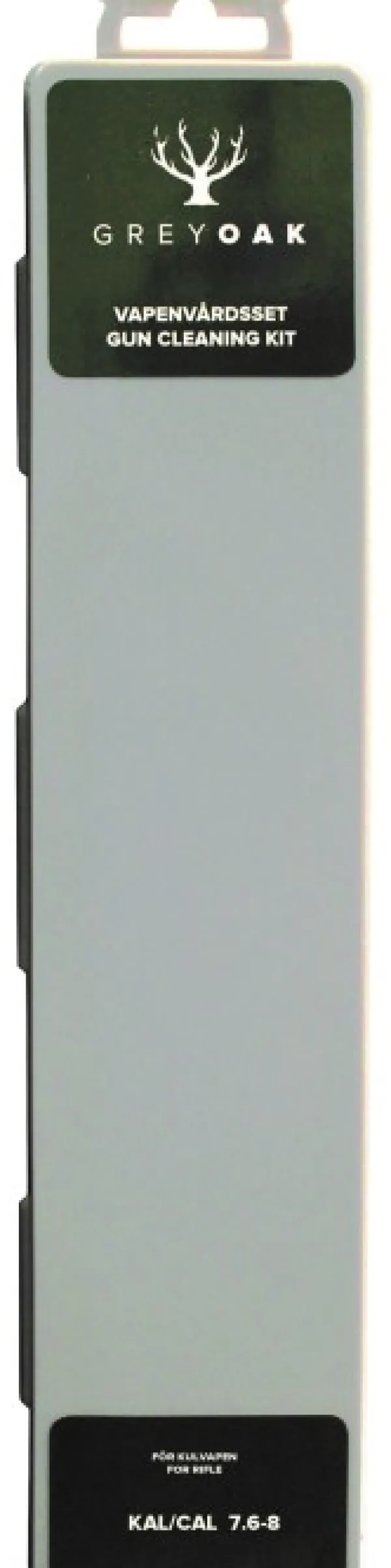 Grey Oakin aseenpuhdistussarja. Paketti sisältää puhdistuspuikon, terässpiraaliharjan, puuvillaharjan, kupariharjan ja pidikkeen puhdistusliinalle.