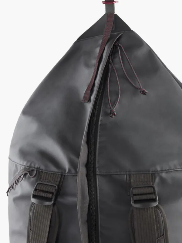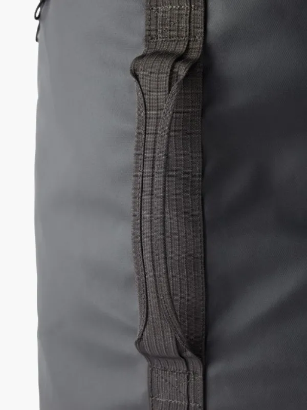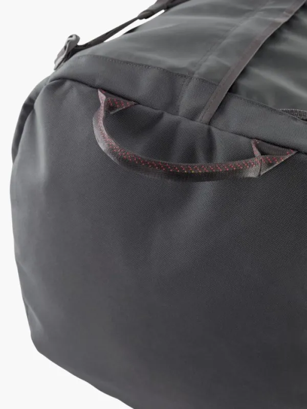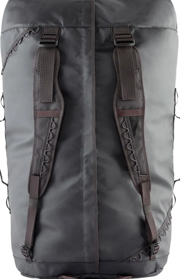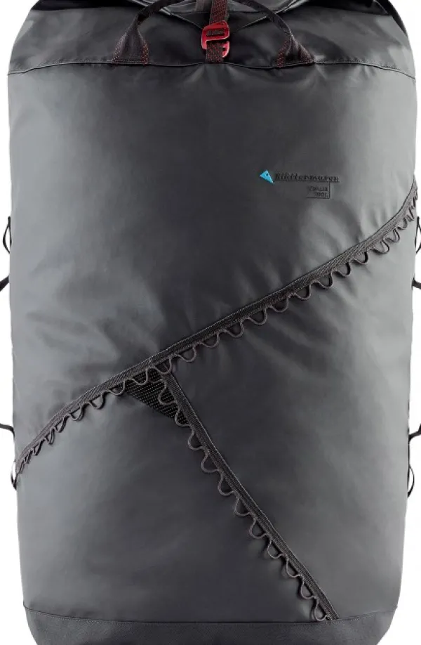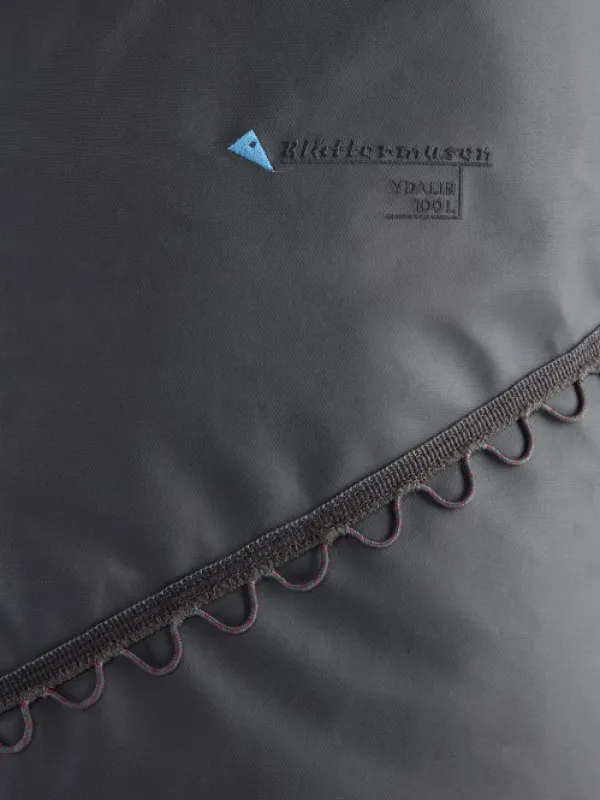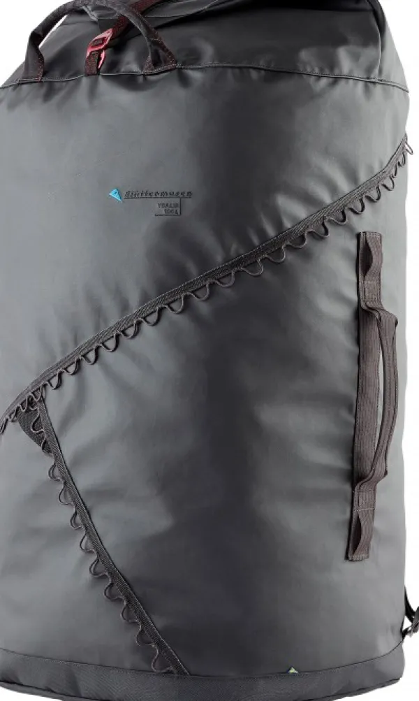Klättermusen Ydalir laukku vedenpitävästä kankaasta. Laukku on todella kestävä Cordura Ecomade-vahvistusten ansiosta. Laukussa on kantokahvat molemmilla sivuilla sekä vakaa kantokahva yhdellä kädellä kantamiseen. Laukussa on myös pehmustetut ja irrotettavat olkahihnat, jotta laukkua voi käytää reppuna. Laukussa on pitkä, suora vetoketju, joka jatkuu toiselle sivulle, mikä helpottaa pakkaamista ja purkamista. Useita kiinnityspisteitä laukun ulkopuolella tarvikkeille ja lisäosille. Sivuilla olevien kantokahvojen vieressä on lenkit, joiden avulla laukun saa viritettyä remmillä auton tai vastaavan katolle. Laukun saa myös pakattua pienempään tilaan.