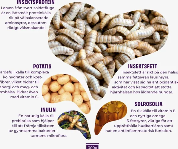 Ruoka sisältää prebiootteja (FOS) tukemaan suoliston terveyttä sekä terveellisiä rasvahappoja hyönteisistä, jotka on todettu omaavan antioksidanttista vaikutusta.