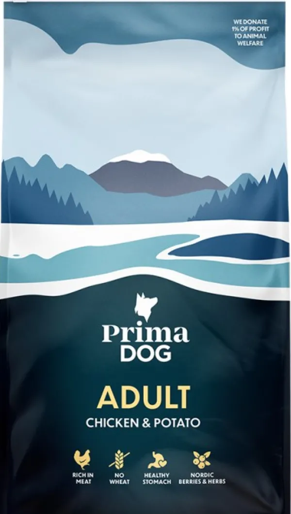 PrimaDog Chicken & Potato on laadukas täysravinto kaikille koirille. Ruoan proteeninlähteenä on maukas ja helposti sulava kananliha. Hiilhydraatit koira saa peruna, maissi ja omena. Ruokaan on lisätty lohiöljyä, joka pitää koiran turkin ja ihon hyvässä kunnossa sekä tukee aivojen ja silmien terveyttä. Pohjoiset yrtit ja marjat lakka, tilli, puolukka ja tyrnimarja antavat koiralle vitamiineja, kivennäisiä ja antioksidantteja. Sisältää suolistolle tärkeitä MOS- ja FOS-prebiootteja. Yucca-uute heikentää ulosteen hajua. PrimaDog Chicken & Potato -täysravinnossa ei ole vehnää, sian- tai naudanlihaa, soijaa, väriaineita, keinotekoisia aromeja tai GMO-raaka-aineita. Ruoan korkeaa laatua valvotaan ISO 9001 ja HACCP -laadunvalvontajärjestelmien avulla.