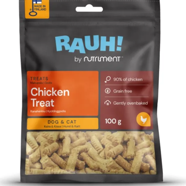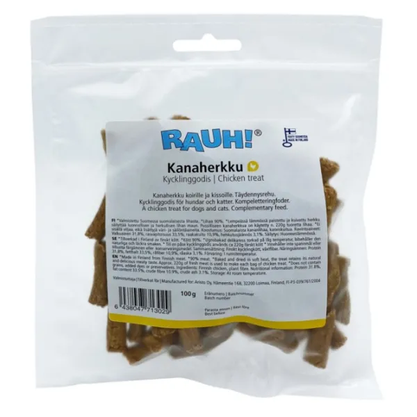 RAUH! Godis KYCKLING 100 g on herkku, jota sekä koirat että kissat rakastavat. Miksi et siis tarjoaisi herkkua, joka tulee hyvin hoidetuista suomalaisista kanoista? Kanaherkku on uunissa paistettu ja matalassa lämpötilassa kuivattu delikates, joka säilyttää luonnollisen ja herkullisen makunsa.