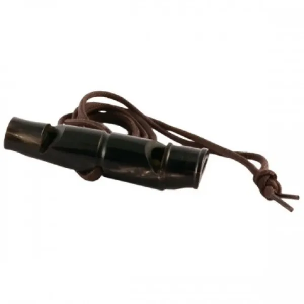 Stabilotherm-koirapilli koiran luokse kutsumiseen. Pilli on valmistettu mustasta sarvesta, ja siinä on käytännöllinen kaulanauha, josta sen voi ripustaa kaulaan tai ranteeseen.