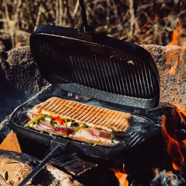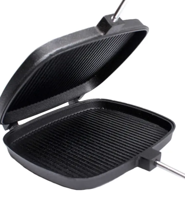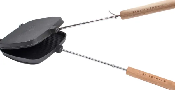 Stabilothermin valurautainen grilliparila. Parilassa on pitkät kahvat, joiden päissä on puuosat, joten parilan käyttäminen avotulella on helppoa ja turvallista. Monipuolista parilaa voi käyttää esimerkiksi voileipien, hampurilaisten, lihan, makkaroiden ja vihannesten grillaamiseen.