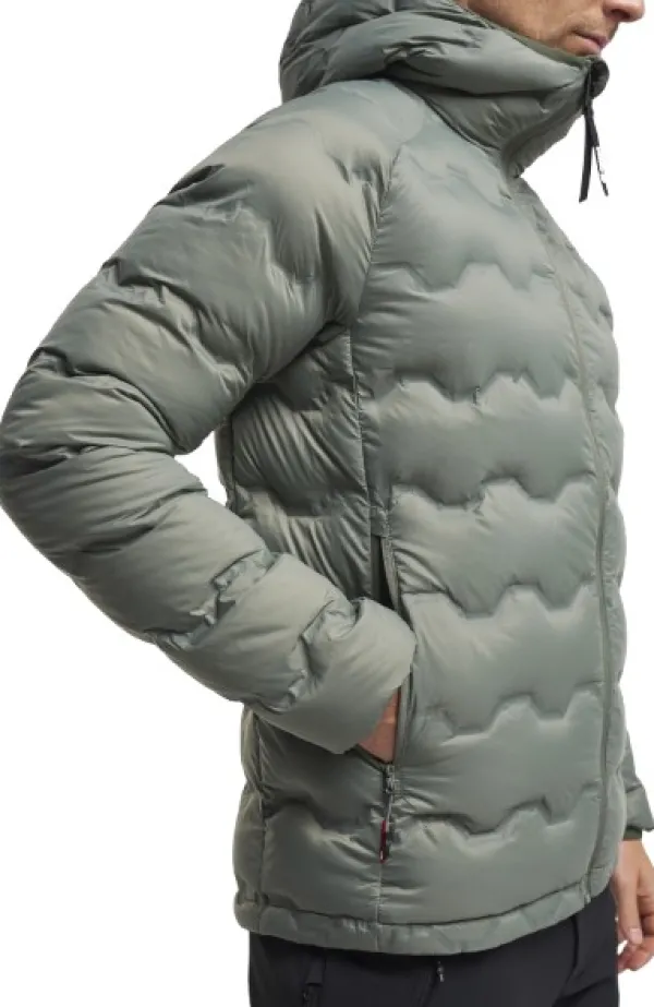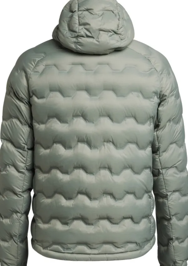Untuvatakki on valmistettu 100 % kierrätetystä polyamidista, jossa on liimatut kanavat vastuullisesti hankitulla, jäljitettävällä untuvalla täytettynä. Lisäksi siinä on PFC-vapaa vettähylkivä pintakäsittely.